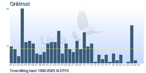 | 14 | Gråtrost | Fieldfare | Turdus pilaris | 2 |