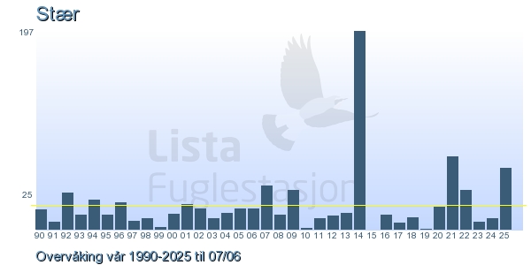 Her ser du resultater av merkeaktiviteten på Lista Fuglestasjon. Du kan velge om du vil ha Dagstall (detaljerte merketall for hver dag), Månedslister (totalsum hver dag for en måned), Sesongdata (status for sesongen), Årslister (artsoversikt for et år) eller Artsliste Lista fuglestasjon (Hele artslisten for merkede fugler på Lista Fuglestasjon).