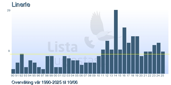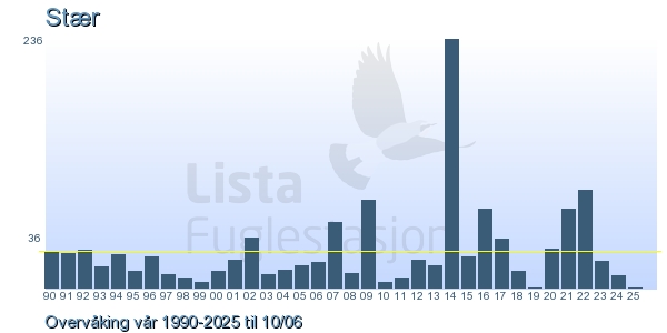 Her ser du resultater av merkeaktiviteten på Lista Fuglestasjon. Du kan velge om du vil ha Dagstall (detaljerte merketall for hver dag), Månedslister (totalsum hver dag for en måned), Sesongdata (status for sesongen), Årslister (artsoversikt for et år) eller Artsliste Lista fuglestasjon (Hele artslisten for merkede fugler på Lista Fuglestasjon).