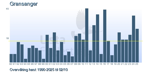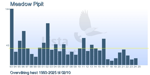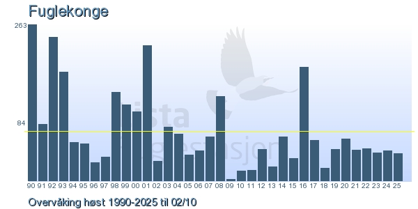 Her ser du resultater av merkeaktiviteten på Lista Fuglestasjon. Du kan velge om du vil ha Dagstall (detaljerte merketall for hver dag), Månedslister (totalsum hver dag for en måned), Sesongdata (status for sesongen), Årslister (artsoversikt for et år) eller Artsliste Lista fuglestasjon (Hele artslisten for merkede fugler på Lista Fuglestasjon).