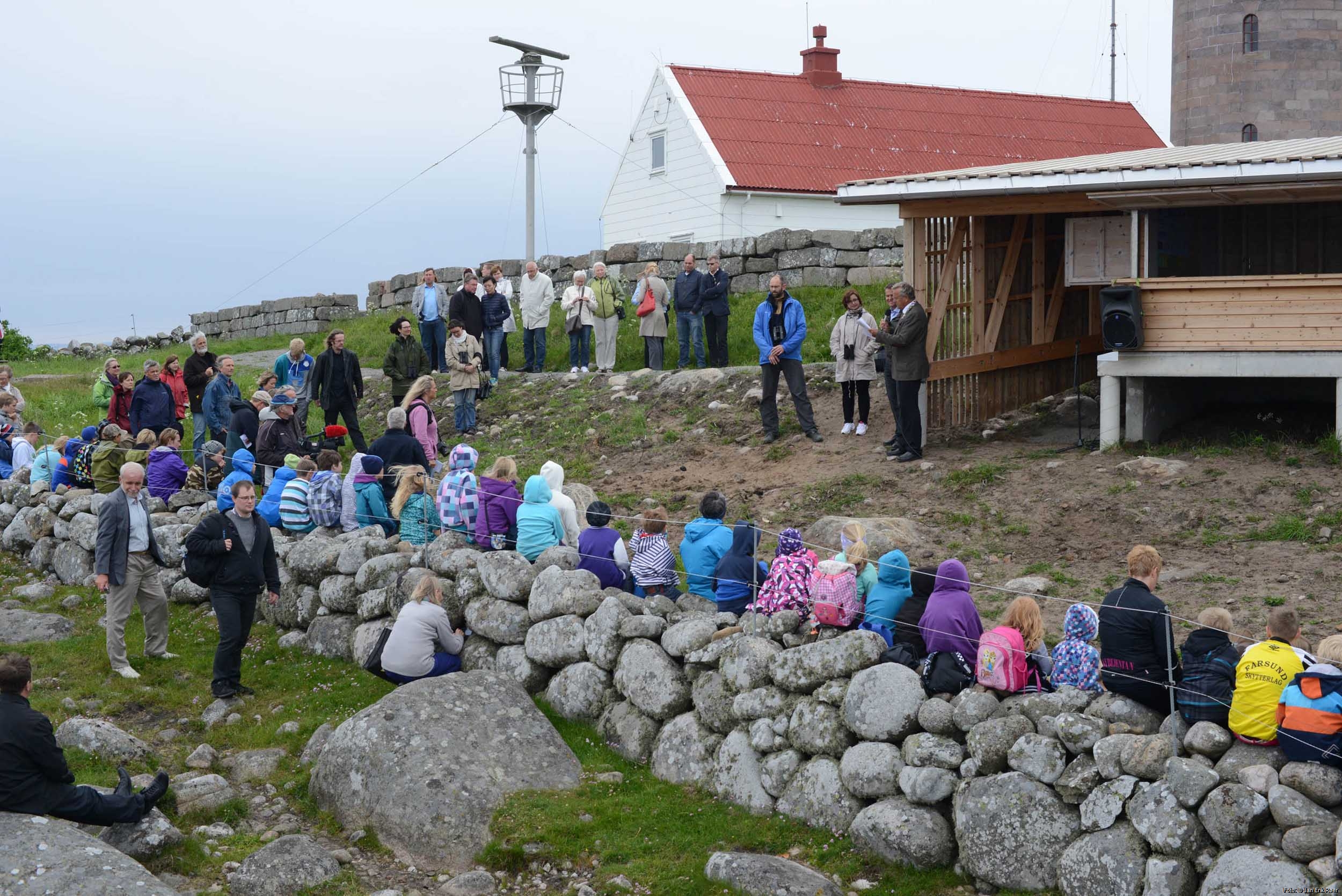 Samling ved sjøfuglbua Borhaug skole og andre samlet i rullesteinene for å høre taler og musikk. Øverst står statssekretær Ellen Øseth med Kjetil Solbakken (NOF), ordfører Richard I. Buch, og naturforvalter Trond Rafoss i Farsund kommune.