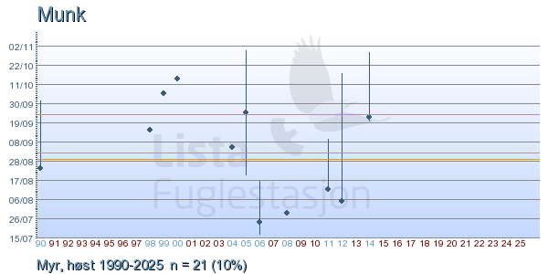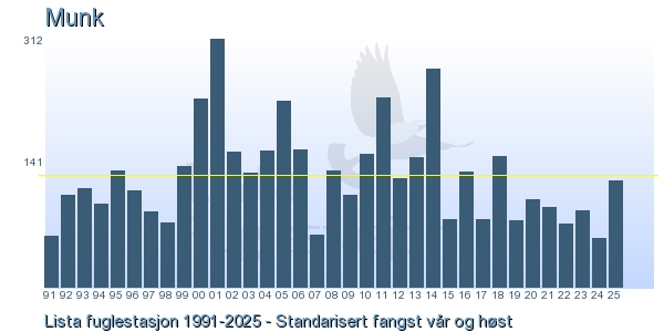 Her ser du resultater av merkeaktiviteten på Lista Fuglestasjon. Du kan velge om du vil ha Dagstall (detaljerte merketall for hver dag), Månedslister (totalsum hver dag for en måned), Sesongdata (status for sesongen), Årslister (artsoversikt for et år) eller Artsliste Lista fuglestasjon (Hele artslisten for merkede fugler på Lista Fuglestasjon).