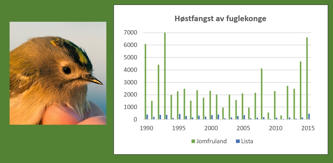 Mens fuglekonge viser signifikante negative langtidstrender ved Lista og Jomfruland fulestasjoner, i den standardiserte nettfangsten ved fuglestasjonene var fuglekonge veldig god på høsten 2015. Antallet ved begge fuglestasjonene var det høyeste siden 1993.