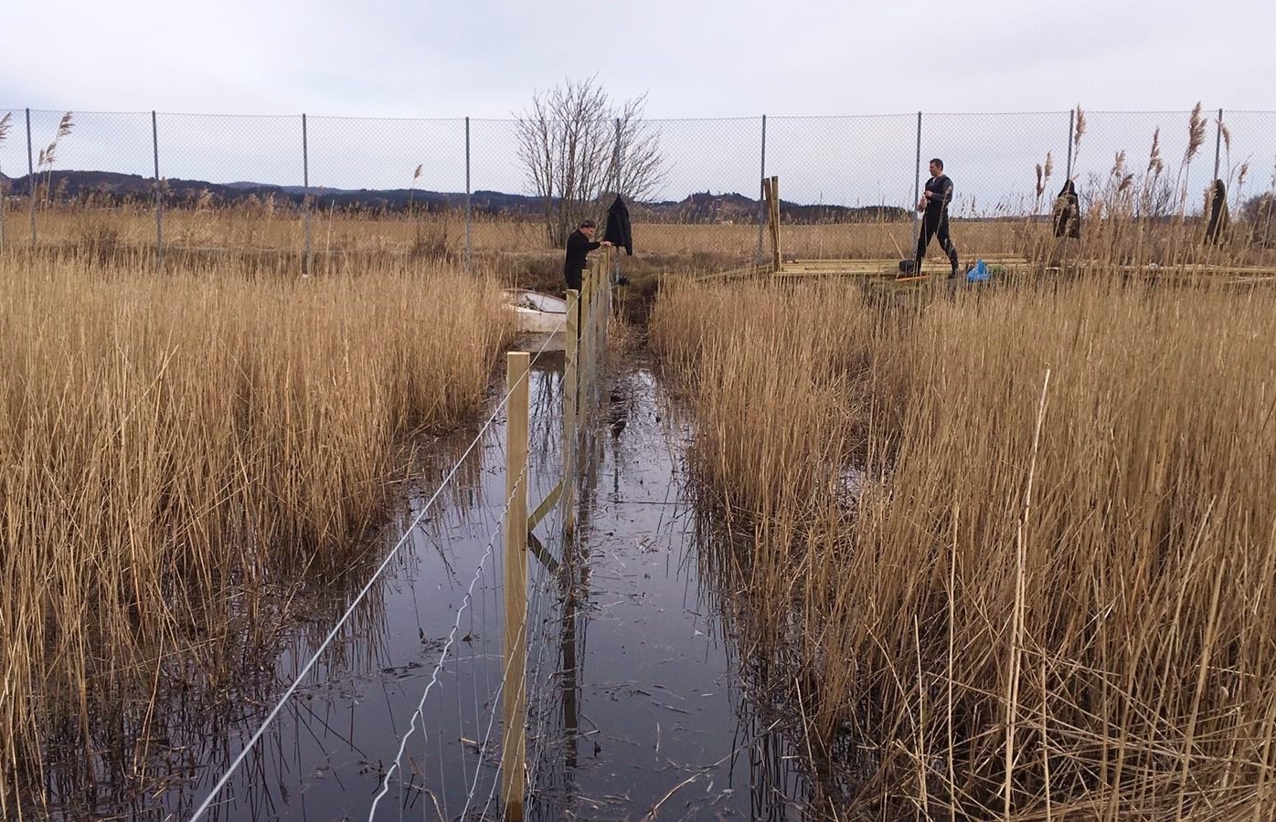 Bygger gjerdet ved hjelp av båt