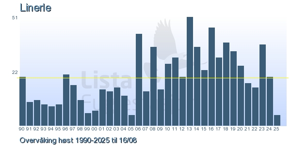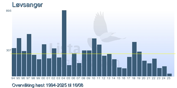 Her ser du resultater av merkeaktiviteten på Lista Fuglestasjon. Du kan velge om du vil ha Dagstall (detaljerte merketall for hver dag), Månedslister (totalsum hver dag for en måned), Sesongdata (status for sesongen), Årslister (artsoversikt for et år) eller Artsliste Lista fuglestasjon (Hele artslisten for merkede fugler på Lista Fuglestasjon).