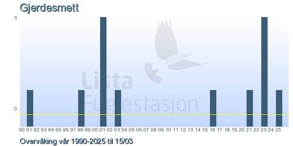 Her ser du resultater av merkeaktiviteten på Lista Fuglestasjon. Du kan velge om du vil ha Dagstall (detaljerte merketall for hver dag), Månedslister (totalsum hver dag for en måned), Sesongdata (status for sesongen), Årslister (artsoversikt for et år) eller Artsliste Lista fuglestasjon (Hele artslisten for merkede fugler på Lista Fuglestasjon).