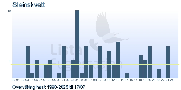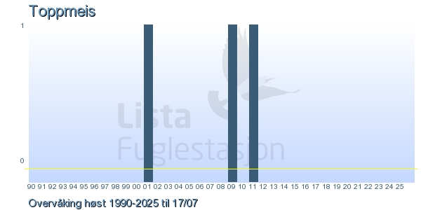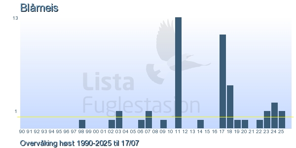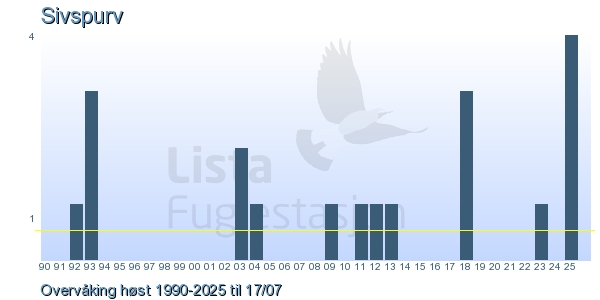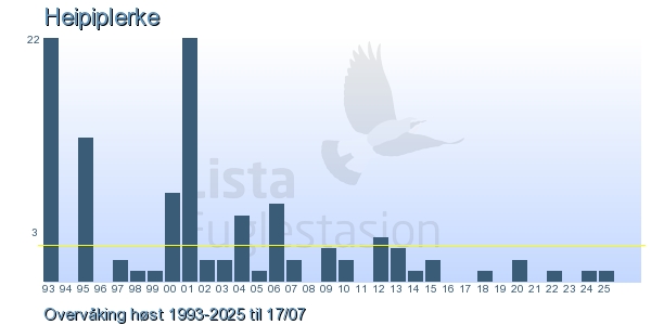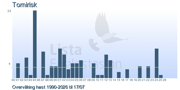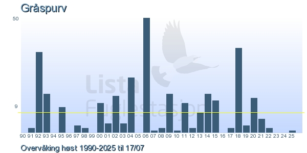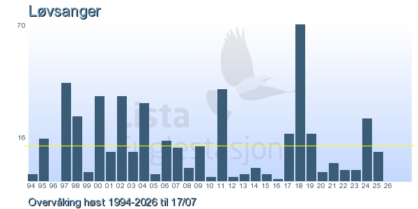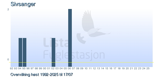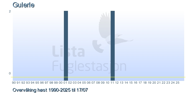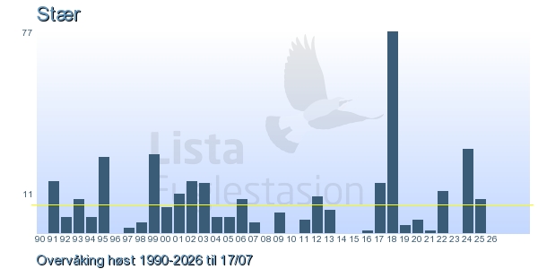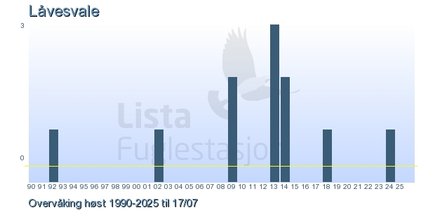 Her ser du resultater av merkeaktiviteten på Lista Fuglestasjon. Du kan velge om du vil ha Dagstall (detaljerte merketall for hver dag), Månedslister (totalsum hver dag for en måned), Sesongdata (status for sesongen), Årslister (artsoversikt for et år) eller Artsliste Lista fuglestasjon (Hele artslisten for merkede fugler på Lista Fuglestasjon).