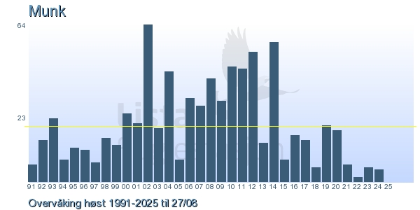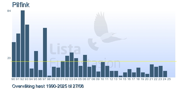 Her ser du resultater av merkeaktiviteten på Lista Fuglestasjon. Du kan velge om du vil ha Dagstall (detaljerte merketall for hver dag), Månedslister (totalsum hver dag for en måned), Sesongdata (status for sesongen), Årslister (artsoversikt for et år) eller Artsliste Lista fuglestasjon (Hele artslisten for merkede fugler på Lista Fuglestasjon).
