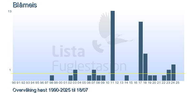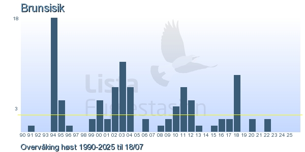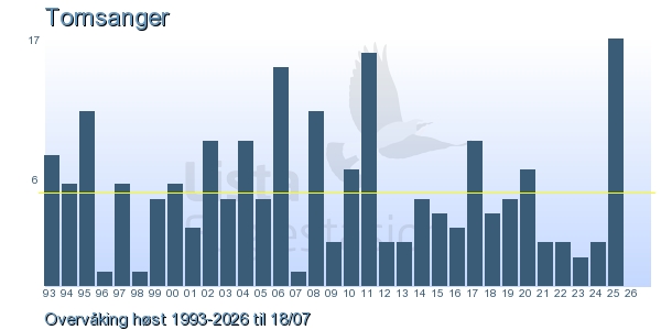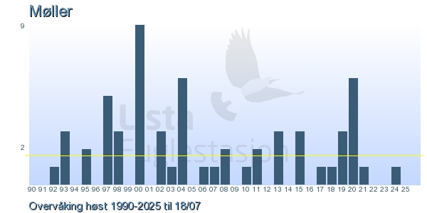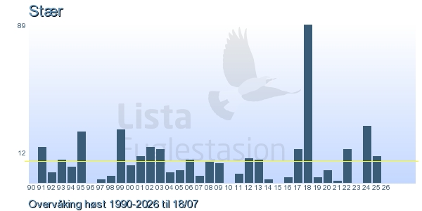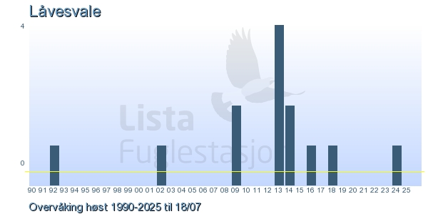 Her ser du resultater av merkeaktiviteten på Lista Fuglestasjon. Du kan velge om du vil ha Dagstall (detaljerte merketall for hver dag), Månedslister (totalsum hver dag for en måned), Sesongdata (status for sesongen), Årslister (artsoversikt for et år) eller Artsliste Lista fuglestasjon (Hele artslisten for merkede fugler på Lista Fuglestasjon).