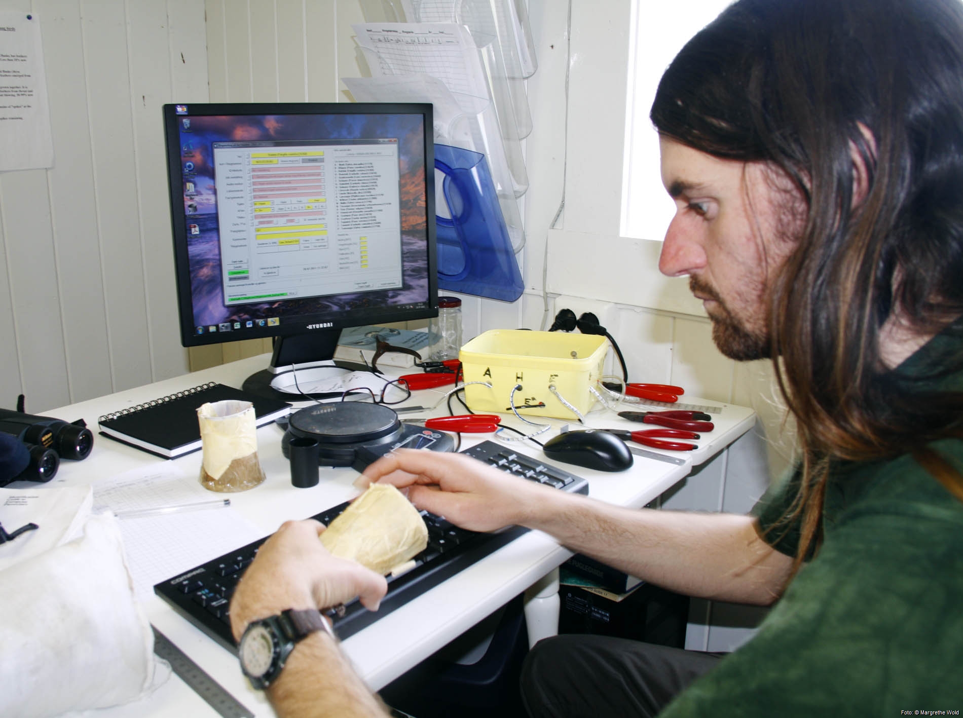 By the ringing table. As the bird is examined, all data gets saved electronically.