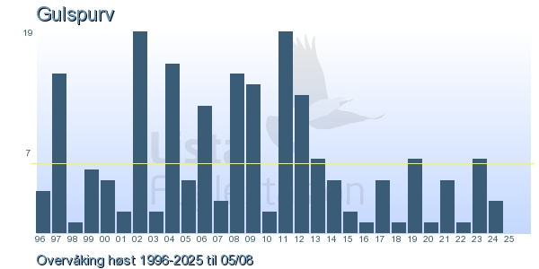 Her ser du resultater av merkeaktiviteten på Lista Fuglestasjon. Du kan velge om du vil ha Dagstall (detaljerte merketall for hver dag), Månedslister (totalsum hver dag for en måned), Sesongdata (status for sesongen), Årslister (artsoversikt for et år) eller Artsliste Lista fuglestasjon (Hele artslisten for merkede fugler på Lista Fuglestasjon).