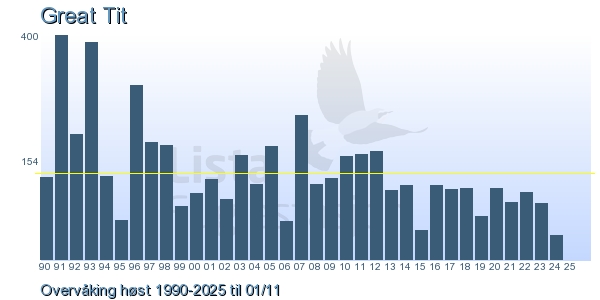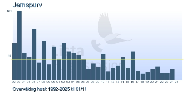 Her ser du resultater av merkeaktiviteten på Lista Fuglestasjon. Du kan velge om du vil ha Dagstall (detaljerte merketall for hver dag), Månedslister (totalsum hver dag for en måned), Sesongdata (status for sesongen), Årslister (artsoversikt for et år) eller Artsliste Lista fuglestasjon (Hele artslisten for merkede fugler på Lista Fuglestasjon).