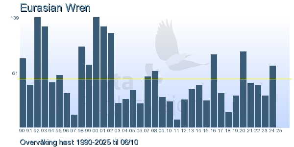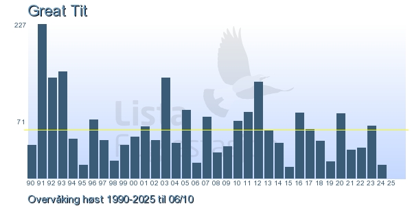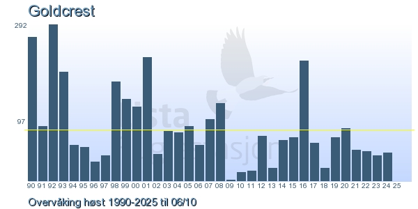 Her ser du resultater av merkeaktiviteten på Lista Fuglestasjon. Du kan velge om du vil ha Dagstall (detaljerte merketall for hver dag), Månedslister (totalsum hver dag for en måned), Sesongdata (status for sesongen), Årslister (artsoversikt for et år) eller Artsliste Lista fuglestasjon (Hele artslisten for merkede fugler på Lista Fuglestasjon).