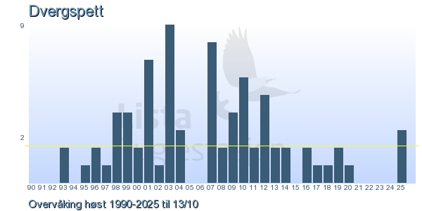 | 1 | Dvergspett | Lesser Spotted Woodpecker | Dryobates minor | 2 |