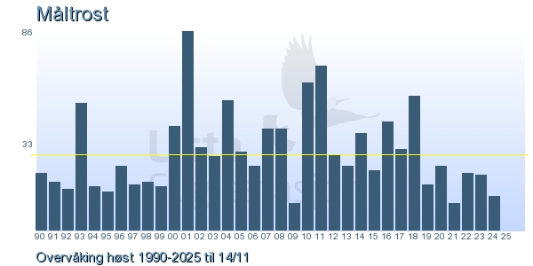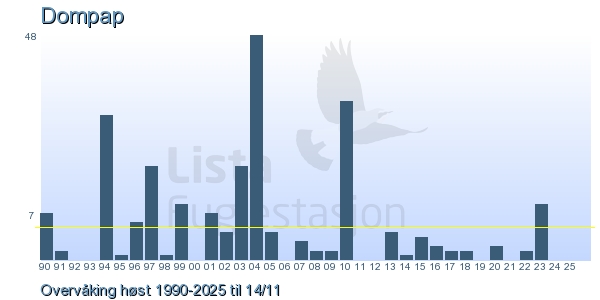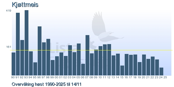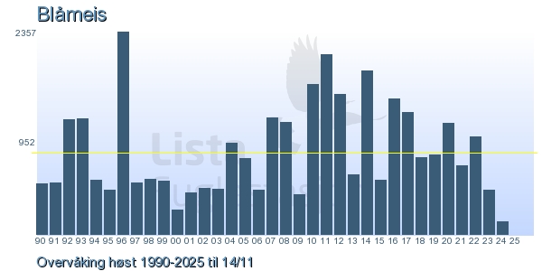 Her ser du resultater av merkeaktiviteten på Lista Fuglestasjon. Du kan velge om du vil ha Dagstall (detaljerte merketall for hver dag), Månedslister (totalsum hver dag for en måned), Sesongdata (status for sesongen), Årslister (artsoversikt for et år) eller Artsliste Lista fuglestasjon (Hele artslisten for merkede fugler på Lista Fuglestasjon).