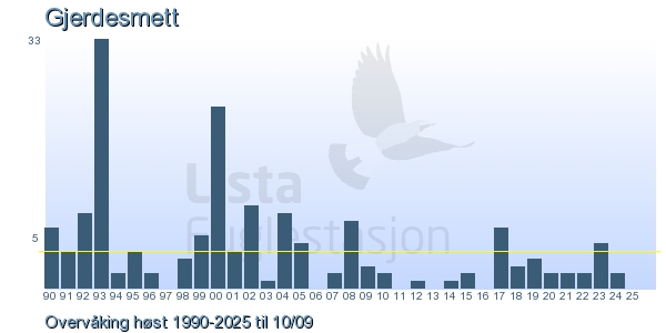 These pages contains the ringing log from Lista Bird Obs. There are several options; Daily log (detailed ringing log for any chosen day), Month log (totals for each day in a month), Season numbers (status for this season), Year list (list of species ringed for any chosen year) or Birdlist Lista Bird Obs. (complete list of species ringed).