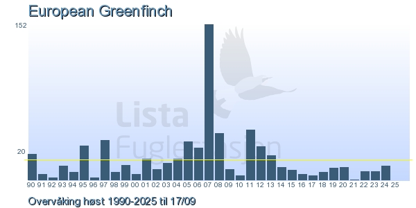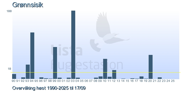 | 8 | Grønnsisik | Eurasian Siskin | Spinus spinus | 7 |
