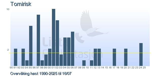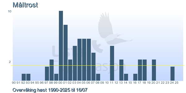 Her ser du resultater av merkeaktiviteten på Lista Fuglestasjon. Du kan velge om du vil ha Dagstall (detaljerte merketall for hver dag), Månedslister (totalsum hver dag for en måned), Sesongdata (status for sesongen), Årslister (artsoversikt for et år) eller Artsliste Lista fuglestasjon (Hele artslisten for merkede fugler på Lista Fuglestasjon).