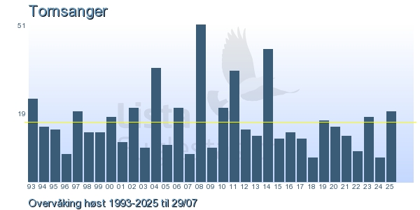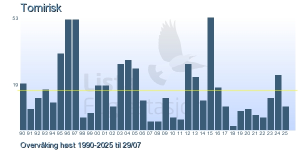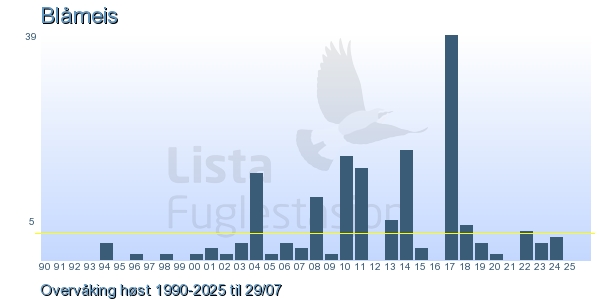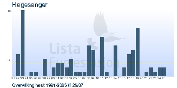 Her ser du resultater av merkeaktiviteten på Lista Fuglestasjon. Du kan velge om du vil ha Dagstall (detaljerte merketall for hver dag), Månedslister (totalsum hver dag for en måned), Sesongdata (status for sesongen), Årslister (artsoversikt for et år) eller Artsliste Lista fuglestasjon (Hele artslisten for merkede fugler på Lista Fuglestasjon).