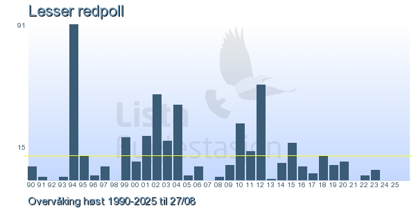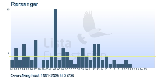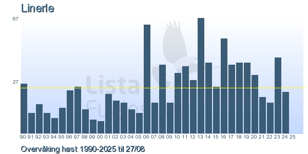 Her ser du resultater av merkeaktiviteten på Lista Fuglestasjon. Du kan velge om du vil ha Dagstall (detaljerte merketall for hver dag), Månedslister (totalsum hver dag for en måned), Sesongdata (status for sesongen), Årslister (artsoversikt for et år) eller Artsliste Lista fuglestasjon (Hele artslisten for merkede fugler på Lista Fuglestasjon).