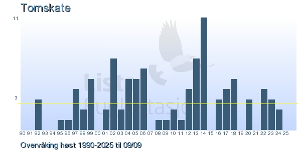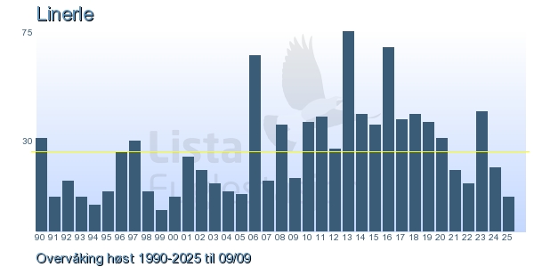 Her ser du resultater av merkeaktiviteten på Lista Fuglestasjon. Du kan velge om du vil ha Dagstall (detaljerte merketall for hver dag), Månedslister (totalsum hver dag for en måned), Sesongdata (status for sesongen), Årslister (artsoversikt for et år) eller Artsliste Lista fuglestasjon (Hele artslisten for merkede fugler på Lista Fuglestasjon).