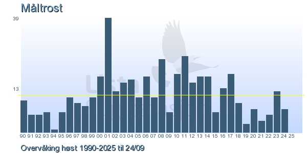 Her ser du resultater av merkeaktiviteten på Lista Fuglestasjon. Du kan velge om du vil ha Dagstall (detaljerte merketall for hver dag), Månedslister (totalsum hver dag for en måned), Sesongdata (status for sesongen), Årslister (artsoversikt for et år) eller Artsliste Lista fuglestasjon (Hele artslisten for merkede fugler på Lista Fuglestasjon).