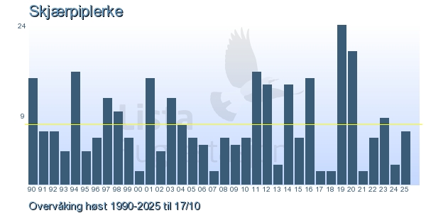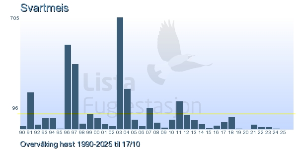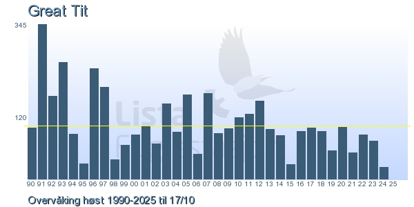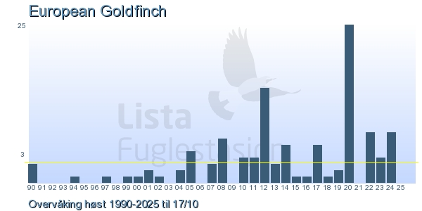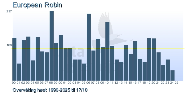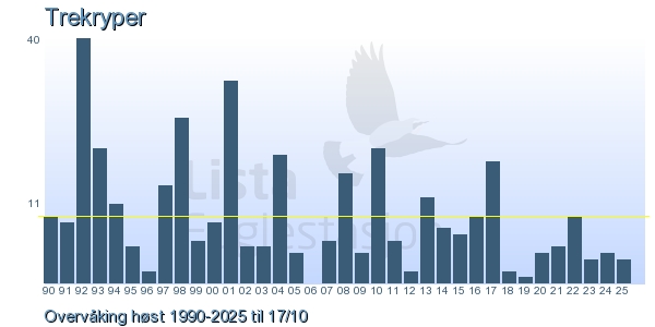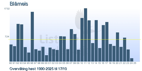 Her ser du resultater av merkeaktiviteten på Lista Fuglestasjon. Du kan velge om du vil ha Dagstall (detaljerte merketall for hver dag), Månedslister (totalsum hver dag for en måned), Sesongdata (status for sesongen), Årslister (artsoversikt for et år) eller Artsliste Lista fuglestasjon (Hele artslisten for merkede fugler på Lista Fuglestasjon).