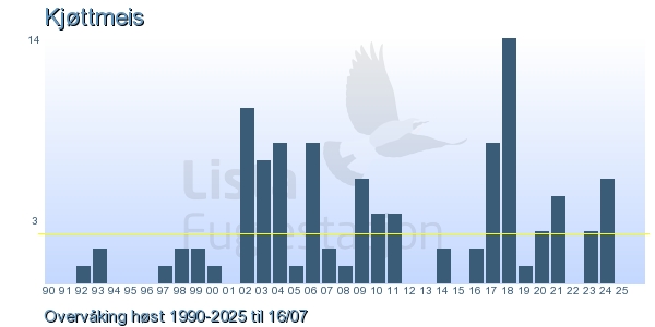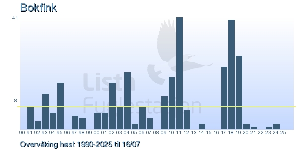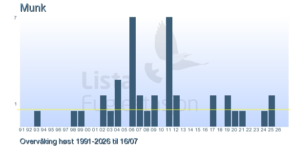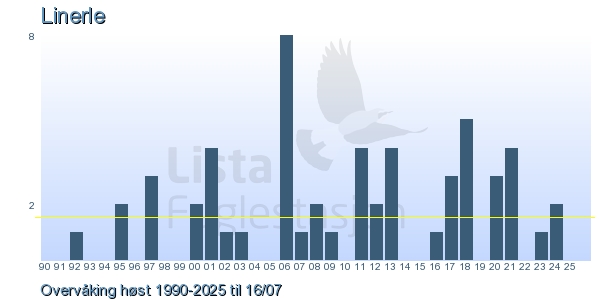 Her ser du resultater av merkeaktiviteten på Lista Fuglestasjon. Du kan velge om du vil ha Dagstall (detaljerte merketall for hver dag), Månedslister (totalsum hver dag for en måned), Sesongdata (status for sesongen), Årslister (artsoversikt for et år) eller Artsliste Lista fuglestasjon (Hele artslisten for merkede fugler på Lista Fuglestasjon).