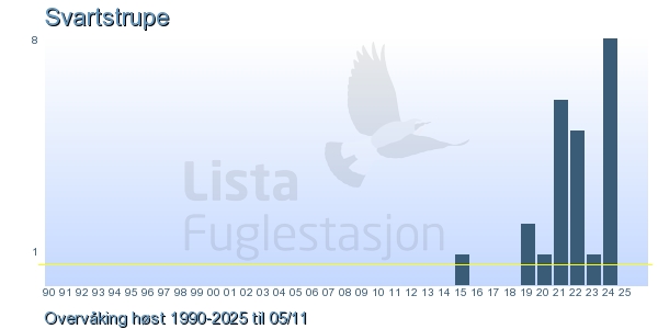 Her ser du resultater av merkeaktiviteten på Lista Fuglestasjon. Du kan velge om du vil ha Dagstall (detaljerte merketall for hver dag), Månedslister (totalsum hver dag for en måned), Sesongdata (status for sesongen), Årslister (artsoversikt for et år) eller Artsliste Lista fuglestasjon (Hele artslisten for merkede fugler på Lista Fuglestasjon).