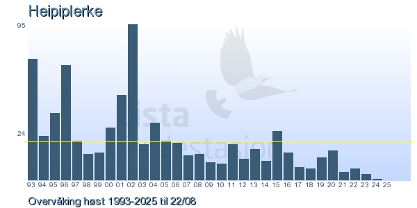 Her ser du resultater av merkeaktiviteten på Lista Fuglestasjon. Du kan velge om du vil ha Dagstall (detaljerte merketall for hver dag), Månedslister (totalsum hver dag for en måned), Sesongdata (status for sesongen), Årslister (artsoversikt for et år) eller Artsliste Lista fuglestasjon (Hele artslisten for merkede fugler på Lista Fuglestasjon).